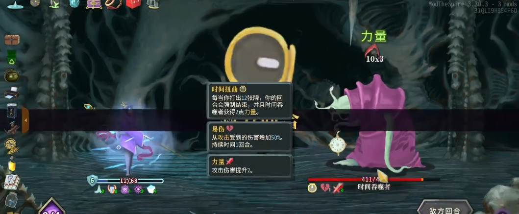 第三层最后一只怪是时间吞噬者,这是一只难度比较大的boss,开局会自带时间扭曲Buff,让自己每打出一张牌都会增加它一点...