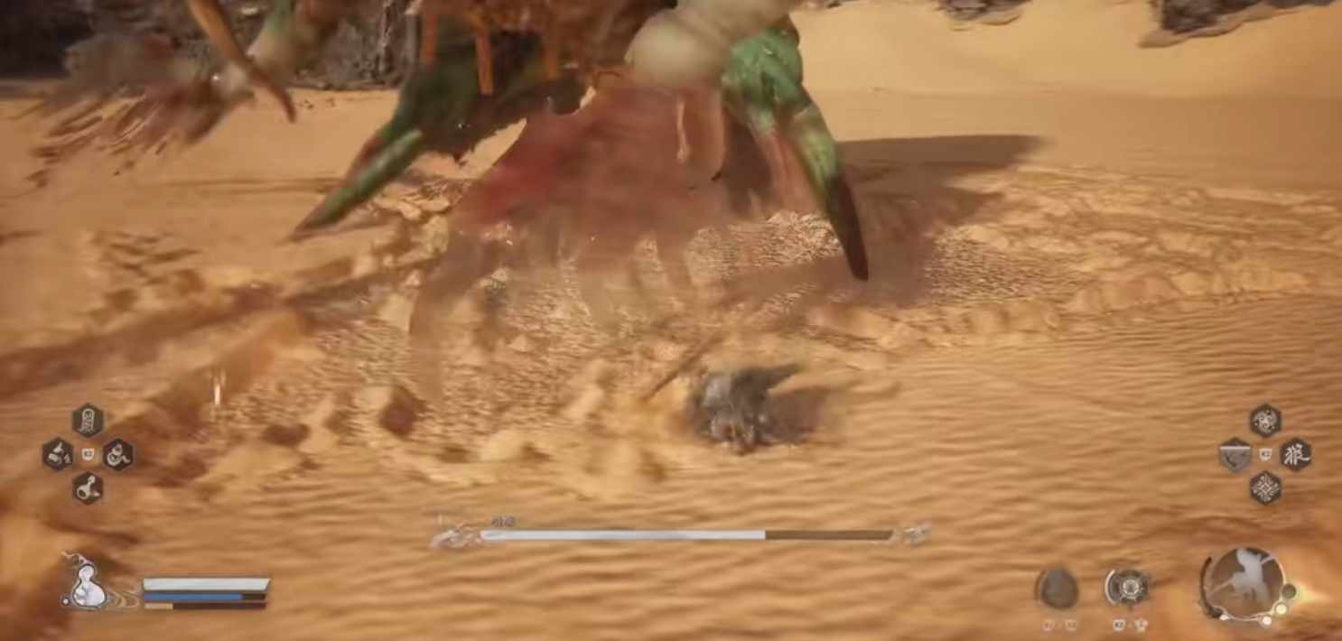 开局进入场地以后它会先挖地,然后钻入沙子里面。这时候咱们的镜头就会自动锁定它进攻来的方向,在它跳出地面的时候往左后方或者...