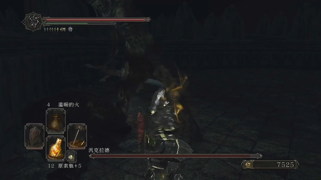 汎克拉德这个BOSS藏在不死灵庙最深处,角色得先解决掉王盾韦施塔德才能见到他。这老头血厚攻高平a一下直接能让人物半血消失...