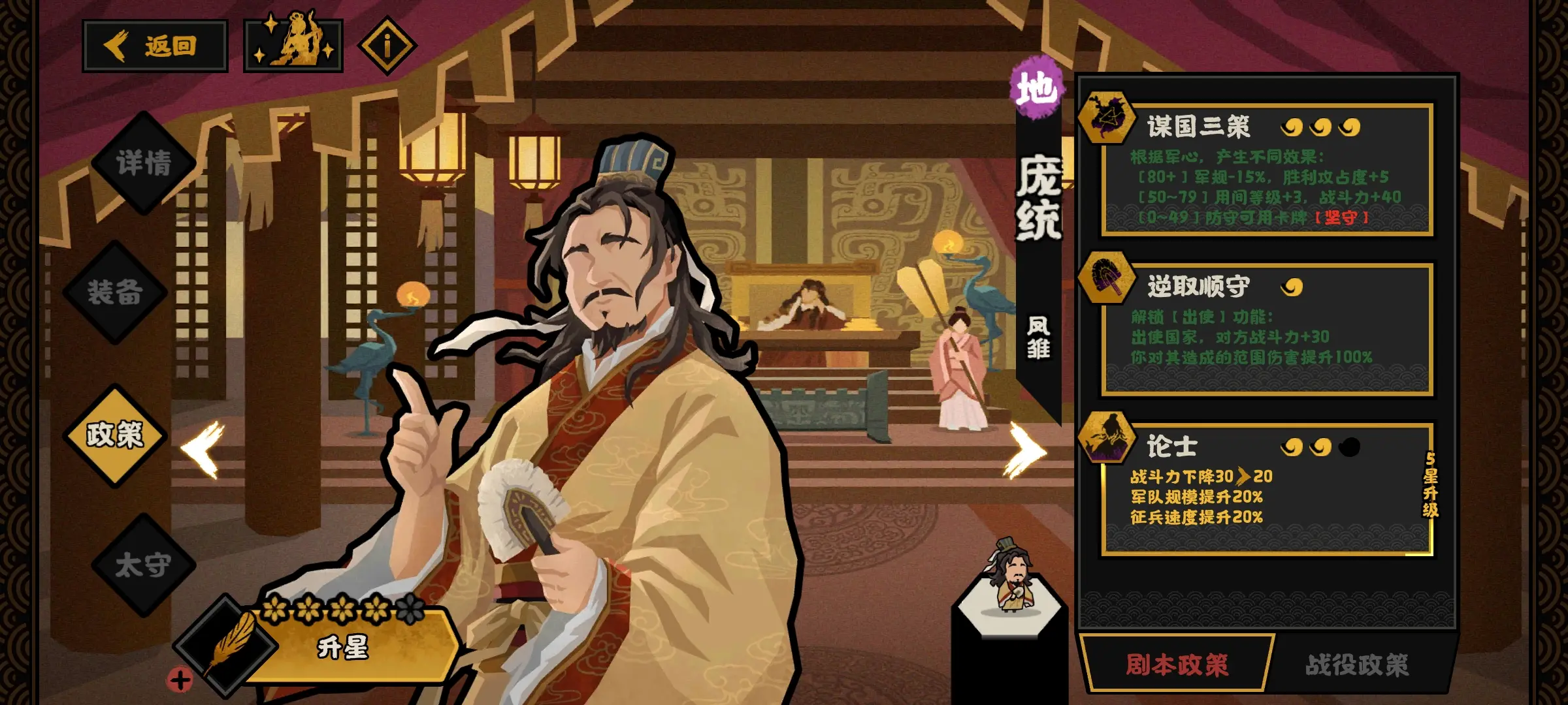 庞统的谋国三策政策开局就能立即施行,因为它不需要用到特殊资源,但是循环后的冷却时间很长。该政策的效果是由玩家当前的军心属...