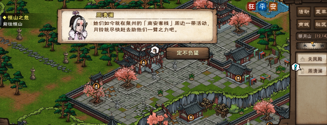 在做倚天迷踪前需要先完成挑战巨石阵和影月往事两个任务,然后还要从梁嫣处出师,因为任务里需要拜师掌门周清澜。向她打听拜师后...