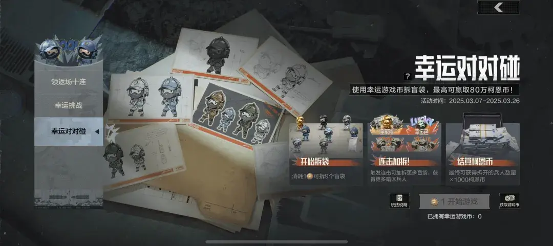 幸运对对碰是一个可以获得大量柯恩币的小游戏,但是参与一局幸运对对碰需要消耗一个幸运游戏币。游戏币通过幸运挑战获得,挑战任...