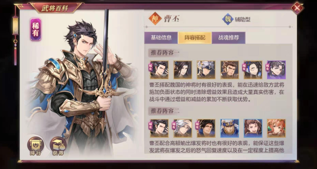 曹丕是一个稀有品质的辅助型神将,在激活职业后我方后排武将普攻时可以为他增加怒气。他的技能可以有效降低敌人对各种负面效果的...