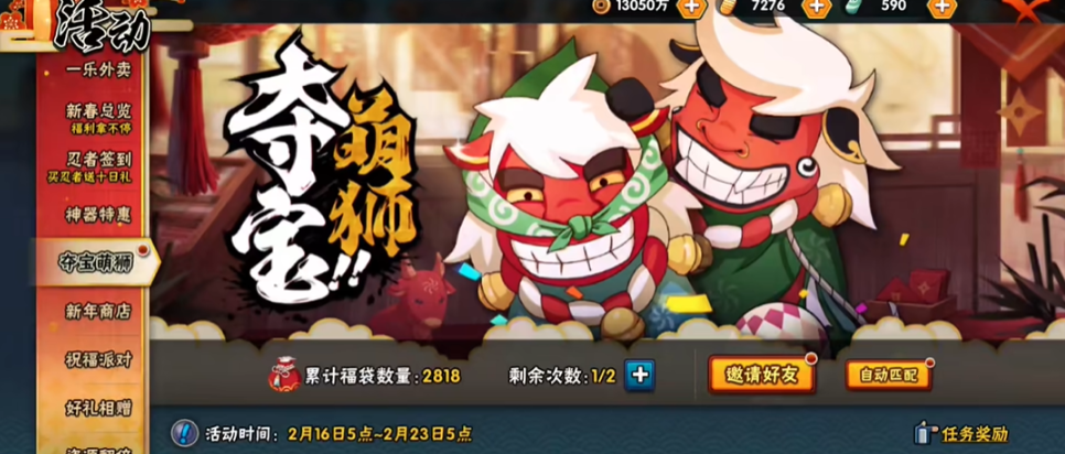 夺宝萌狮是一个需要双人配合的趣味玩法,每天可以挑战两次,还能额外购买一次次数,参与条件是等级达到20级,这是一个战力平衡...