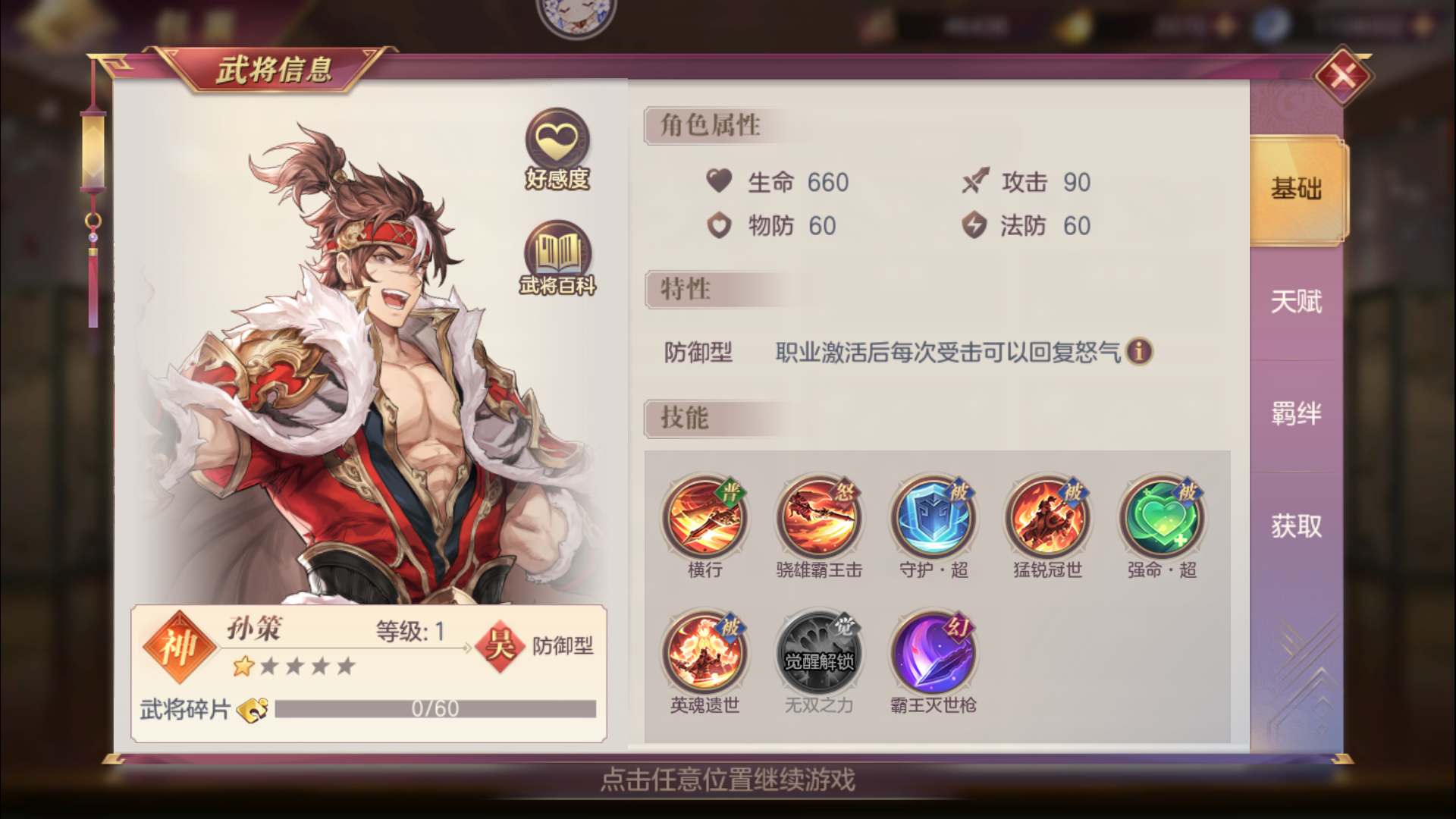 孙策是一个防御型神将,当他每次受到攻击后会增加怒气,也是常见的前排武将之一。他的怒攻会攻击血量比例最低的敌人,并对他造成...