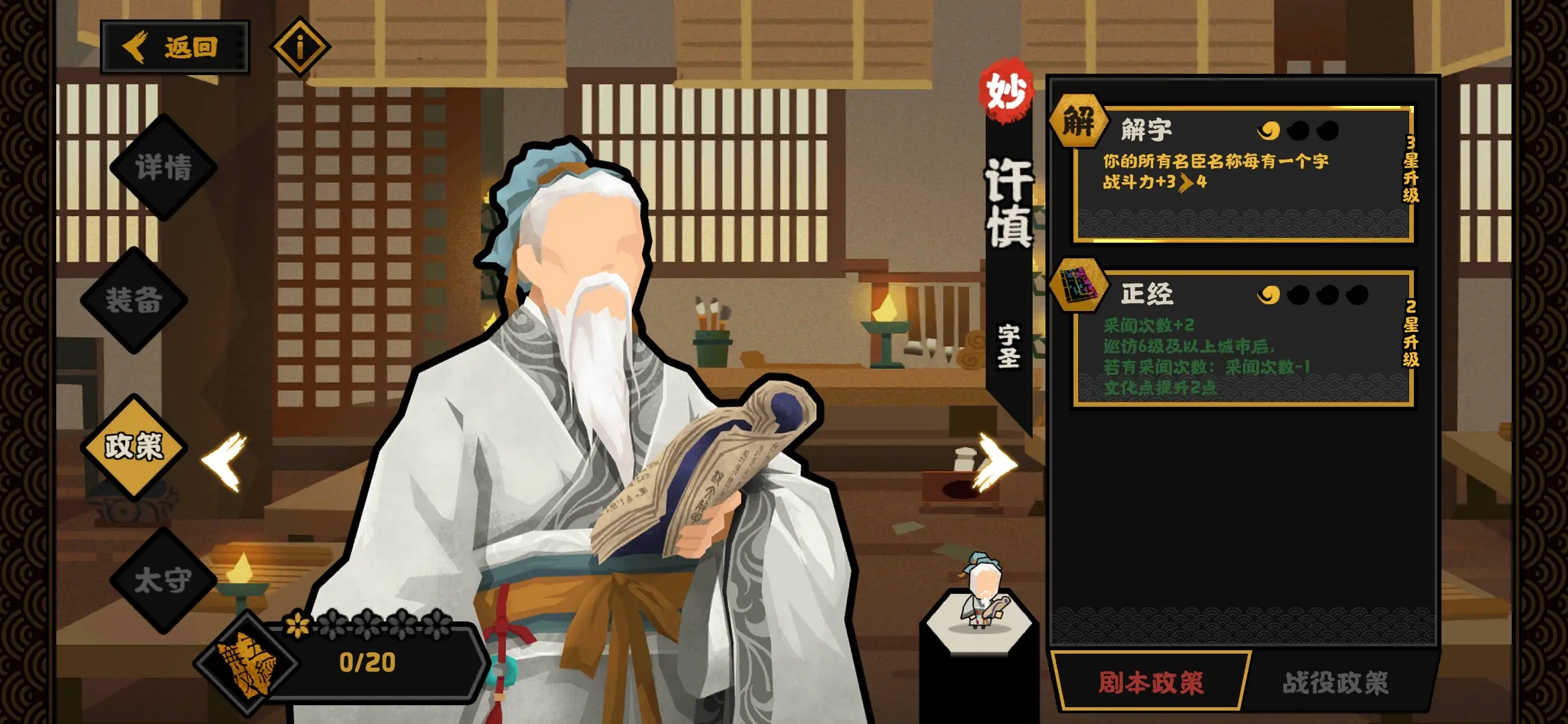 许慎是一个强度不高的妙级名臣,主要是因为他只有两个政策并且有一个政策的收益极低,没有特别好用的政策。这个收益低的政策是解...