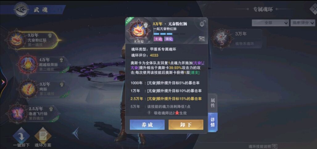 奥斯卡是一个常用的辅助系魂师,因此他的四个魂技位置上都要选择拥有辅助效果的魂环。一技能上建议选择亢奋粉红肠这个甲盾系魂环...