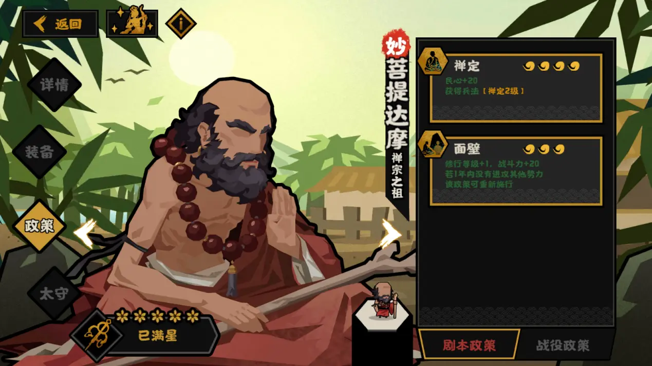 判断菩提达摩是否好用主要看他的政策和太守效果,其中政策又分为在剧本里使用和在战役里使用的政策。剧本政策里的核心为禅定这个...