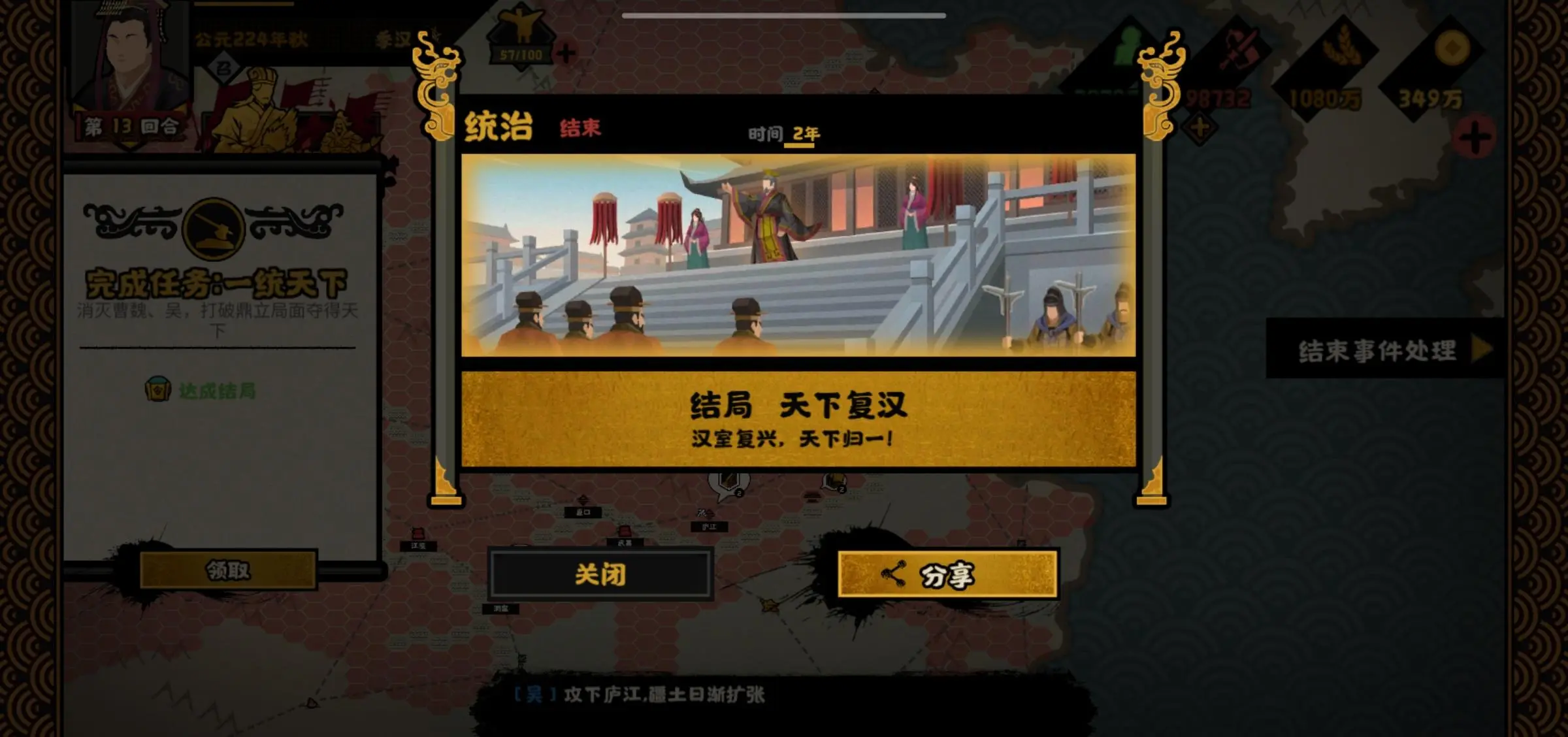 天下复汉是三国鼎立剧本里季汉势力的专属结局,想要打出这个结局需要把吴国和曹魏这两个势力都消灭。另外在发展和征战途中要避免...