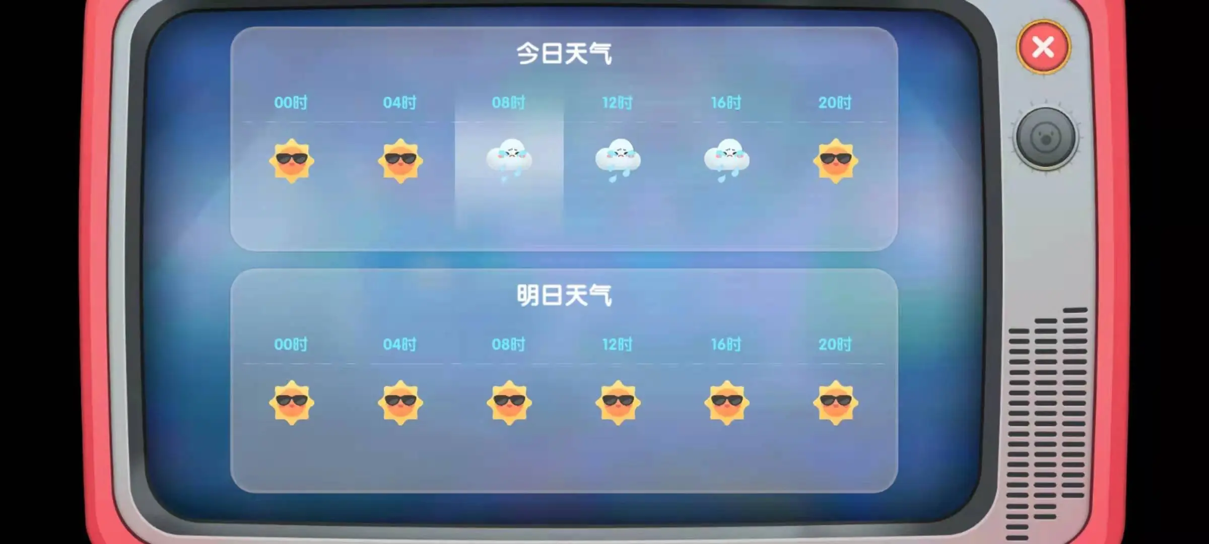 玩家在把主线送的电视机摆放在房子里后就可以和它交互,点击后可以查看今明两天的天气。每天的天气有六个时间段,这里会预告两天...